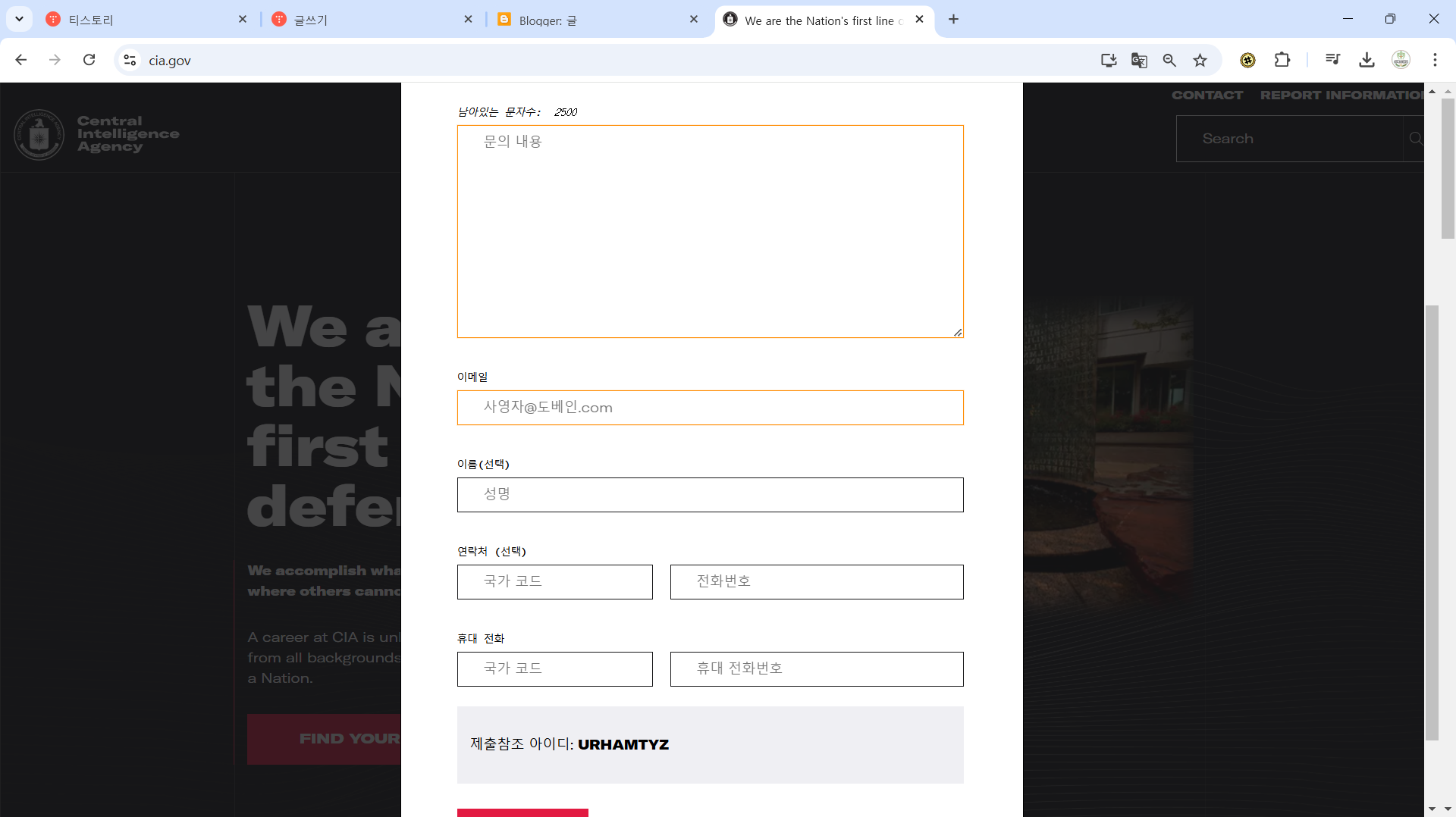 3. 구글번역을 이용해 문의내용을 영어로 작성후 이메일, 연락처, 작성후 제출 클릭