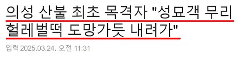 한편, 최초 목격자 증언에 따르면 성묘객 무리가 불이 시작된 시점에 급히 산을 내려가는 모습이 목격되었습니다. 또한, 해당 지역에는 청색 외제 승용차 한 대가 주차되어 있었고, 차 안에는 여성 한 명이 있었다는 진술도 나왔습니다. 그러나 이들이 의도적으로 불을 낸 것인지, 아니면 불이 나서 도망친 것인지는 아직 명확하지 않습니다.