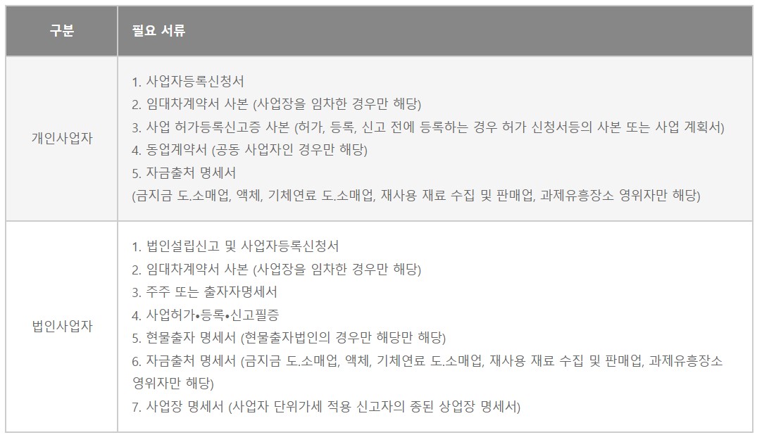 사업자등록은 개인사업자와 법인사업자로 나누어져 있습니다. 사업자 유형에 따라 준비해야 하는 서류가 다르므로 아래 표에서 각각 사업자 별 필요 서류를 확인하고 준비 합니다.