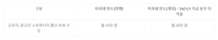 직장에서 보육수당 받으시는 직장인 분들 계실 거예요. 이렇게 지급받은 출산 및 보육수당에서는 세금을 떼지 않는답니다. 이른바 비과세인 셈이죠. 그런데 이 수당은 100% 비과세가 적용되진 않아요. 매월 지급받는 수당에서 10만 원을 한도로 비과세 적용을 해줬기 때문이죠. 하지만 2024년 이후 지급받는 출산, 양육수당부터는 20만 원까지 비과세 혜택을 받아볼 수 있답니다.